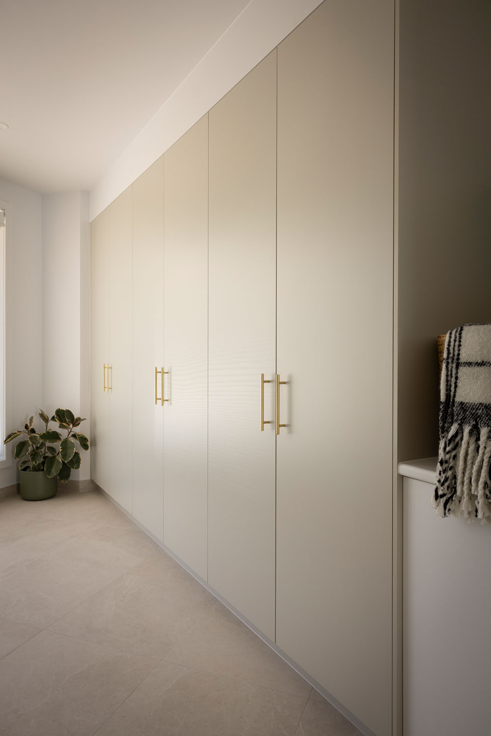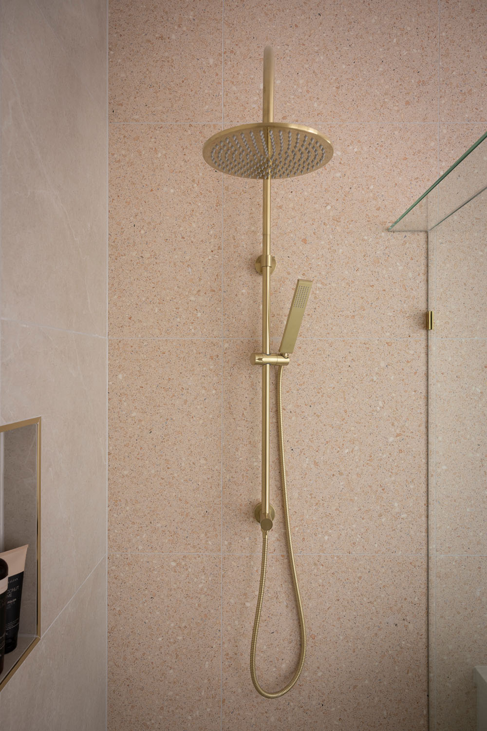 Spare bedrooms are tucked away for visiting family, supported by a generous kitchen featuring sleek timber-look cabinetry that anchors the interior with a soft, contemporary feel. Gentle touches of green, pink terrazzo tiles and gold tapware add personality and a hint of luxury, creating a homely yet sophisticated sanctuary that feels both calm and quietly playful.