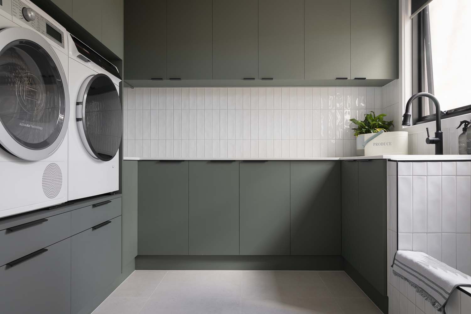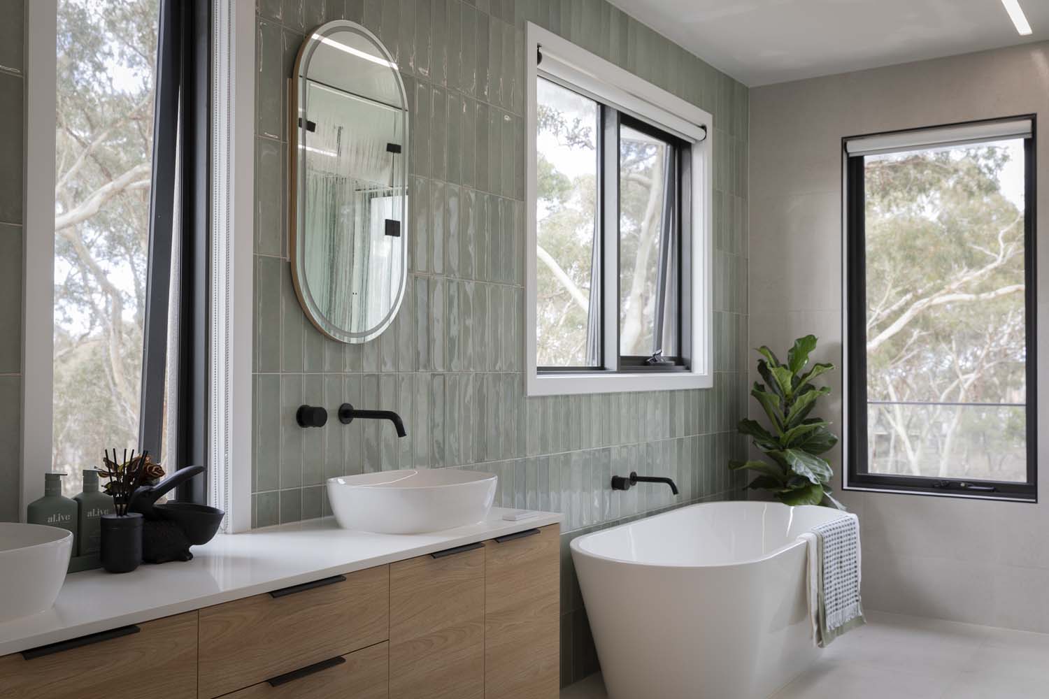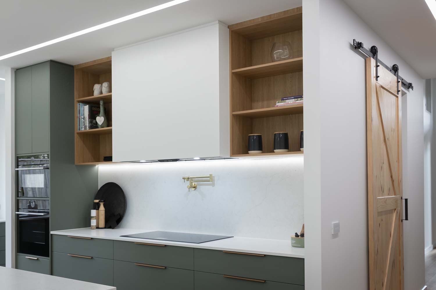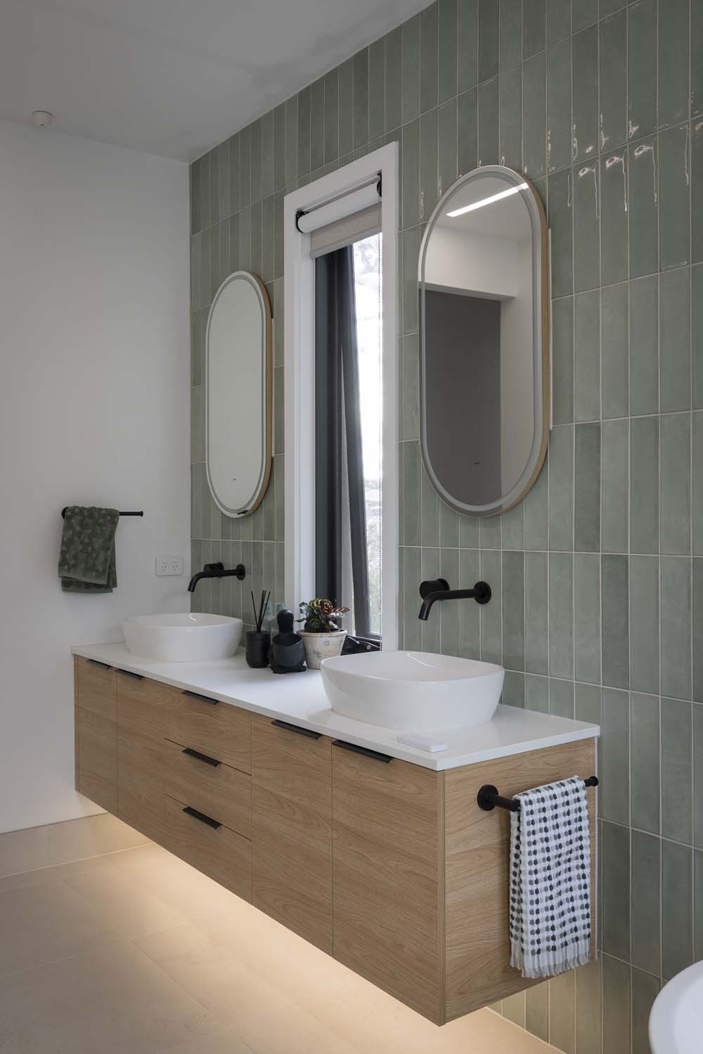 Material selections were made with longevity and elegance in mind. Neutral tones dominate the palette, ensuring the spaces remain fresh and contemporary for years to come, while the kitchen features a striking sage green—a nod to current trends and a touch of personality unique to this build. The master suite is positioned at the rear, overlooking a serene reserve, and offers seamless integration between bedroom and ensuite for privacy and practicality. The dedicated home office, complete with a temperature-controlled equipment storeroom, reflects a commitment to both productivity and aesthetic cohesion, making this residence a showcase of thoughtful, enduring design.
