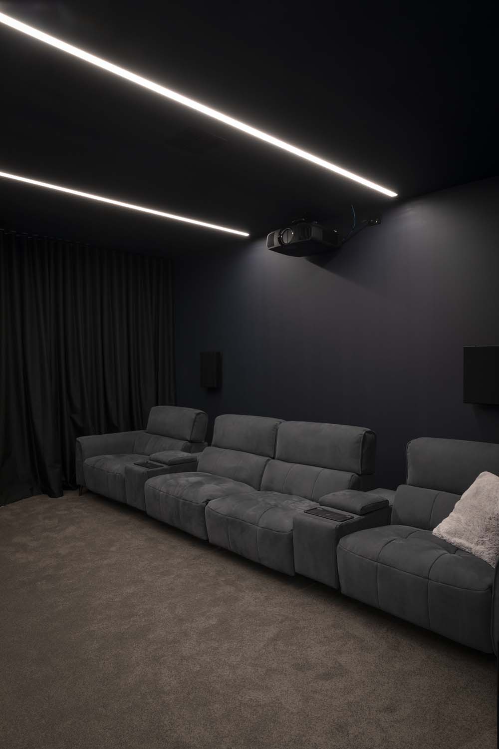This thoughtfully designed home blends modern sophistication with timeless comfort, tailored for clients who value both functionality and style. The aesthetic is defined by an open, airy ambiance achieved through expansive rear windows and strategically placed skylights, flooding the interiors with natural light. The theatre room, equipped with custom Dolby Atmos speakers, offers a cinematic experience that rivals any commercial cinema, while the living area and guest suite are perfect for entertaining and accommodating guests without compromise. Throughout the home, recessed strip lighting and automated features—conceptualized and installed by the homeowner, an electrician—add a layer of subtle luxury and convenience.